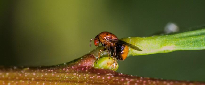 Because of their small size (3-4mm) and short lifespan, you are unlikely to encounter this wasp. Due to their parthenogenic reproduction (females can lay fertile eggs without the need for mating) most adults are females. The males are smaller, slender, black and are expected to be very rarely found. Females start laying eggs immediately after emergence predominantly in new flower buds, and to a lesser extent in the vegetative buds of Sydney golden wattle. Eggs hatch a month later in summer. After hatching, larvae start feeding inside the buds throughout the rest of summer, autumn and winter. As the larvae get larger, internal feeding induces the development of an outgrowth called a gall, instead of inflorescences or new shoots. The galls become more obvious in spring as the larvae grow. Larvae complete feeding and pupate inside a small chamber within the galls in late spring and early summer. After pupation, adults chew their way through the gall to emerge, leaving distinct exit holes on the outside of the galls.