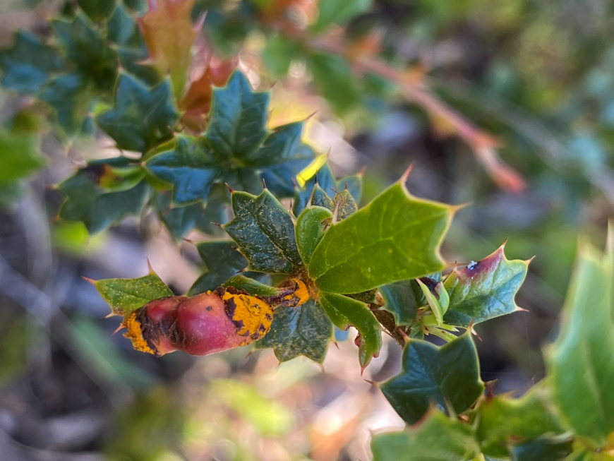 While collecting infected fruits in Chile, Zane and our collaborator, Dr Hernan Norambuena, observed leaf galls on Darwin’s barberry that had not been recorded previously. These galls were formed by psyllids and, interestingly, were also infected by the rust fungus. The psyllids are likely to be host-specific and may represent a potential additional biocontrol agent. Further investigation would be needed, but this discovery highlights how ongoing exploration in a weed’s native range can continue to uncover new opportunities for biological control.